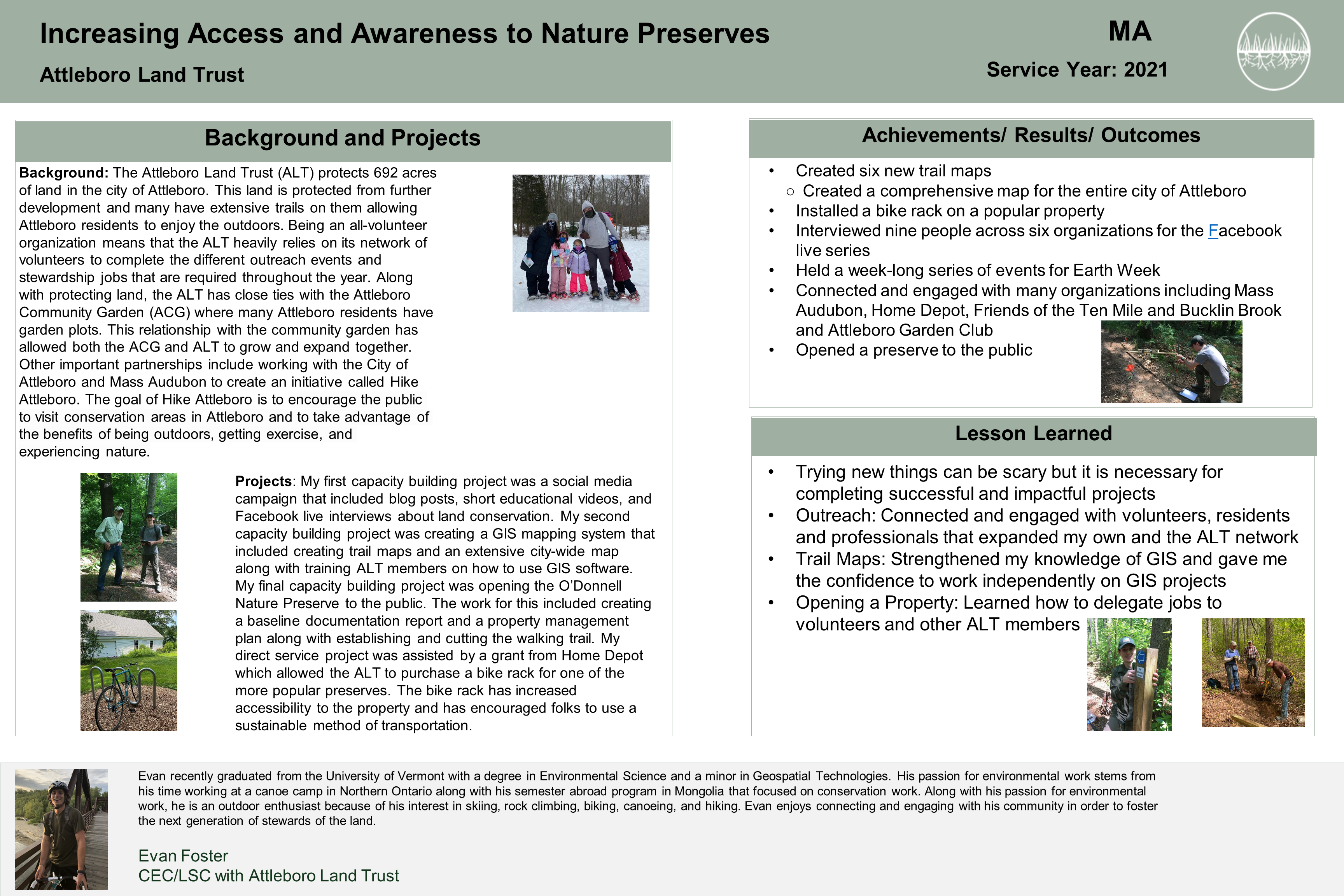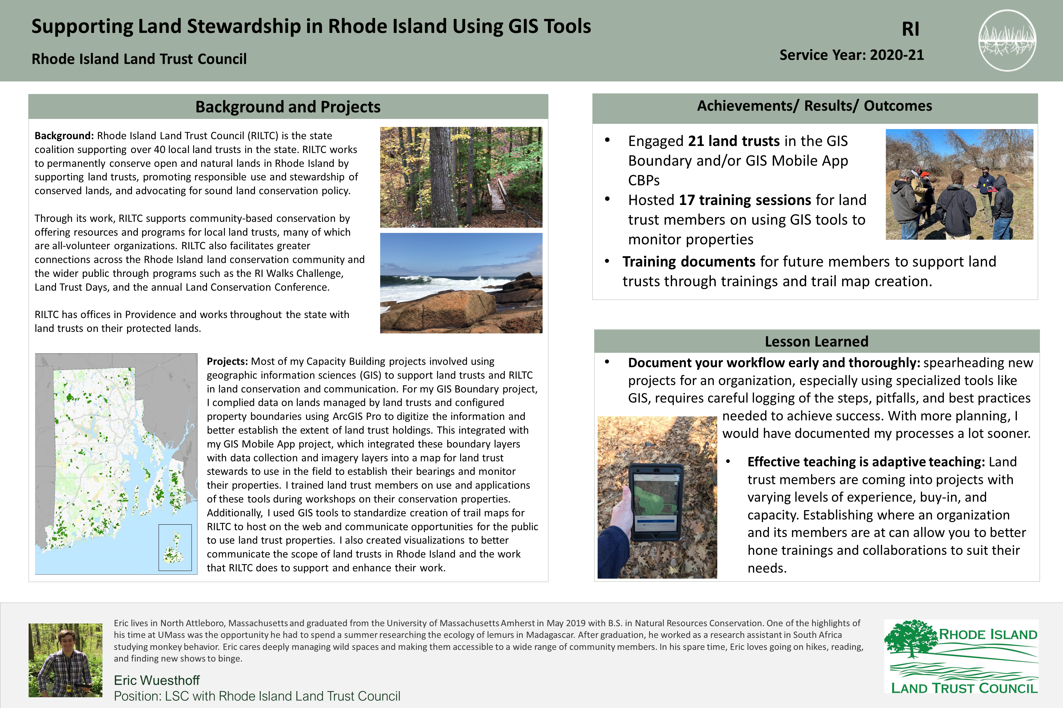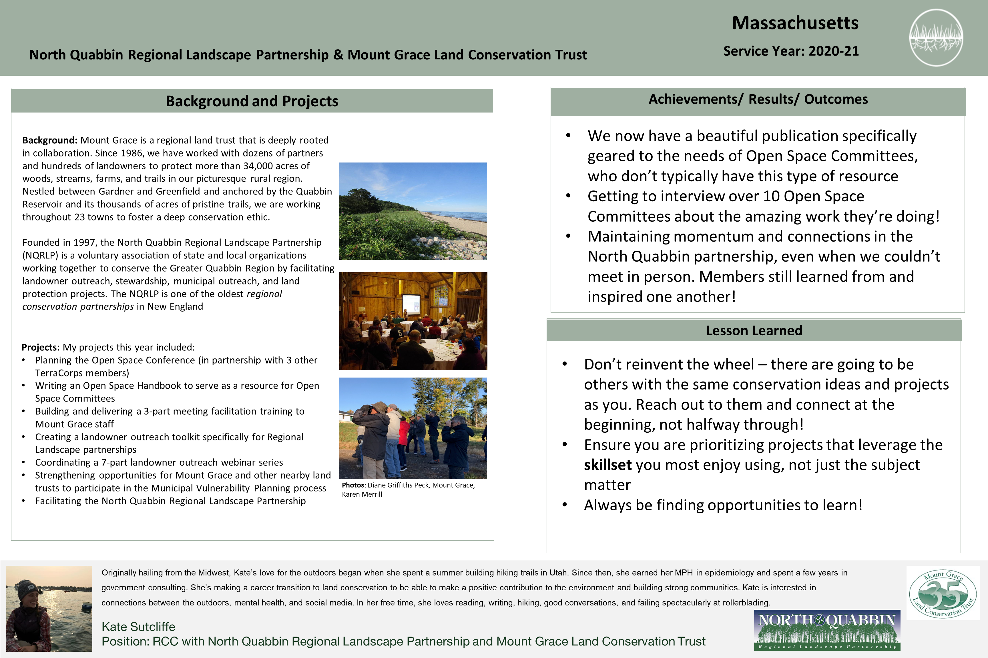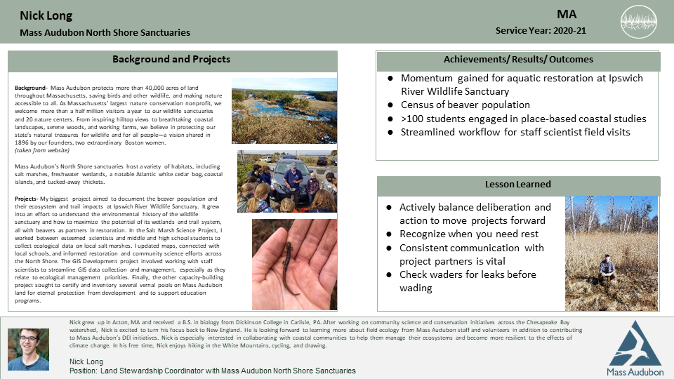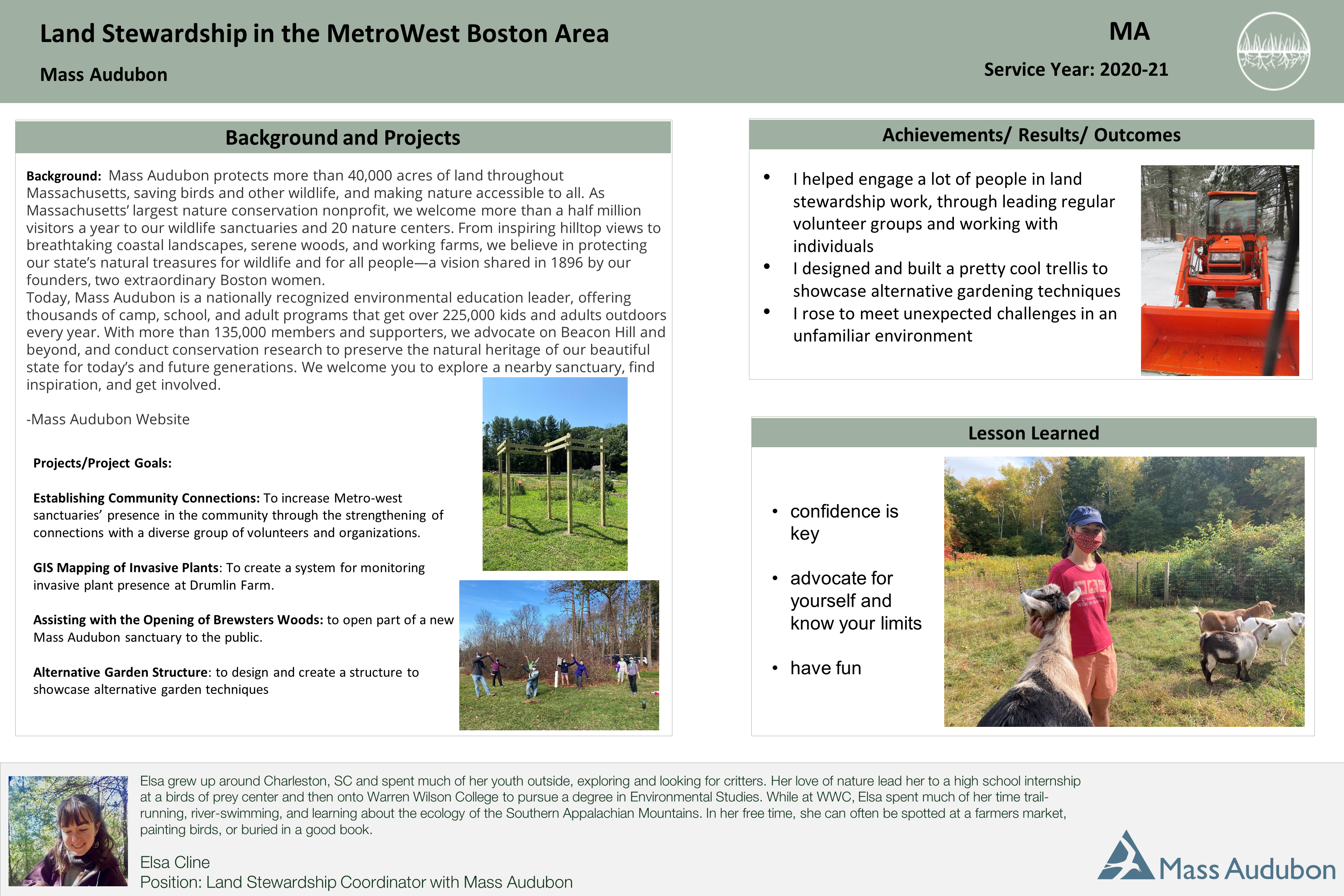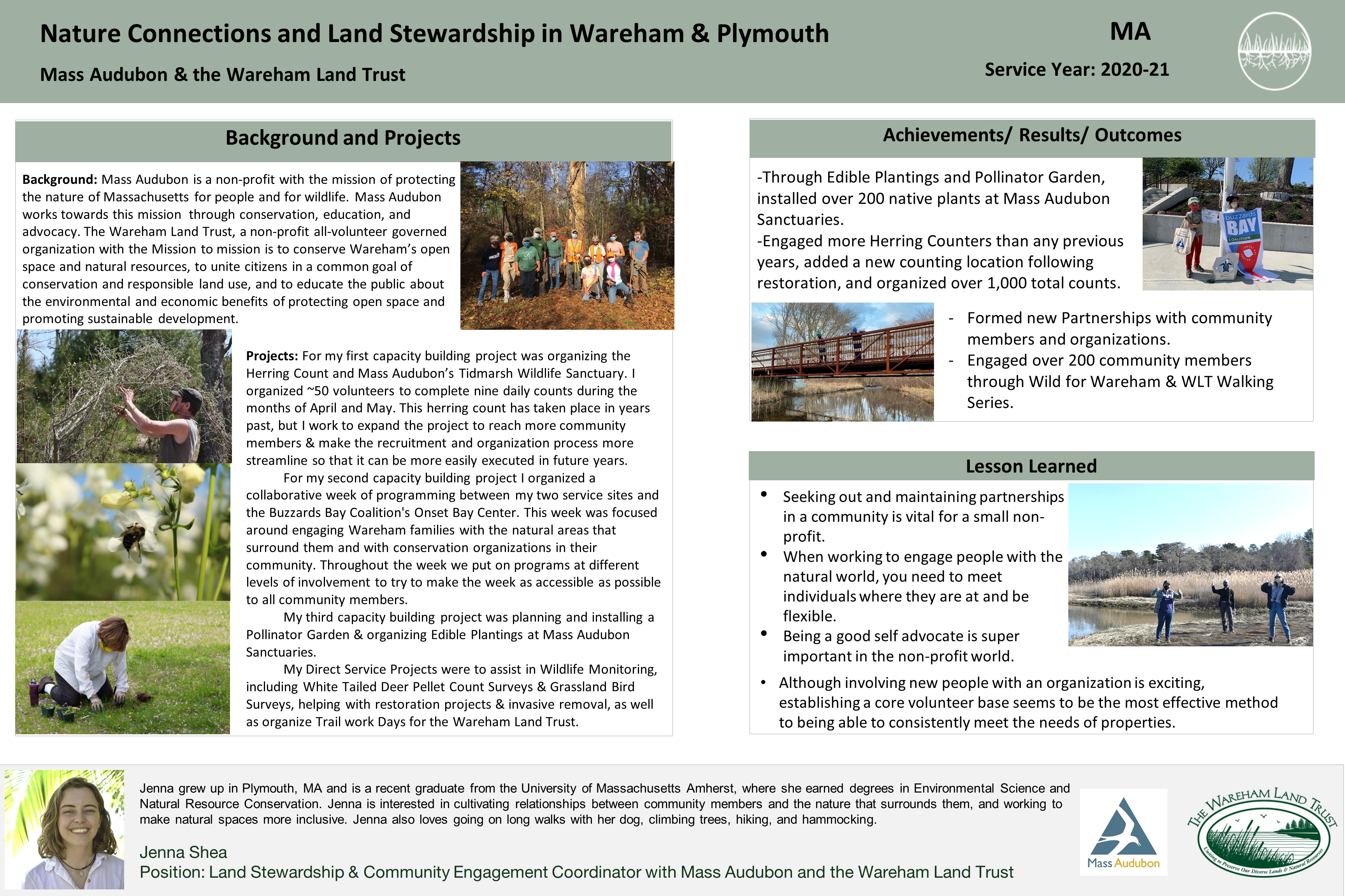 Member Project Posters MASSACHUSETTS 2020-2021 All Community Engagement Youth Education Land Stewardship Regional Collaboration Sustainable Agriculture Aaron Nelson Mount Grace Land Conservation Trust Amy Walker Charles River Watershed Association Anna Smith SEMPBA Anne Flaherty Natick Community Organic Farm Arylle Kathcart CitySprouts Audrey Boraski Hilltown Land Trust Barry Matthews Franklin Land Trust & Hilltown Land Trust Benee Hershon The Food Bank of Western Massachusetts Beth Cronin Round the Bend Farm Brooke Lummis Natick Community Organic Farm Bruce Traban Dartmouth Natural Resources Trust Carly Sharp Gardening the Community Derek Alford Growing Places Elizabeth Lohr Speak for the Trees, Boston Elsa Cline Mass Audubon Evan Foster Attleboro Land Trust Gabrielle Gundry Barnstable Land Trust Jamie Semel Mass Audubon Boston Nature Center Jenna Shea Mass Audubon and the Wareham Land Trust Joelle Boyle Emerald Necklace Conservancy Jonathan Haarstick Sudbury Valley Trustees Kate Schreiber Groundwork Somerville Kate Sutcliffe North Quabbin Regional Landscape Partnership and Mount Grace Land Conservation Trust Katie Adee Full Circle Earth Laura Brockington GreenRoots Laurel Branco Round the Bend Farm Macie Broussard Mass Audubon Conservation Science Maya Sterett Merrimack River Watershed Council Natalie Merline Speak for the Trees Nick Long Mass Audubon North Shore Sanctuaries Patrick Allison Jr. East Quabbin Land Trust Rachel Lee Sharon Mass Audubon Broadmoor Sarah Lucia Community Involved in Sustaining Agriculture Sylvie Raymond GreenRoots Tess O’Day Emerald Necklace Conservancy Victoria Prend Growing Places Zoe Chambliss Natick Community Organic Farm Load More RHODE ISLAND 2020-2021 All Community Engagement Youth Education Land Stewardship Regional Collaboration Sustainable Agriculture Adam Kaszas Aquidneck Community Table Anjali Gordon Aquidneck Community Table Clare Brown Woonasquatucket River Watershed Council Eric Wuesthoff Rhode Island Land Trust Council Joseph Barnes Westerly Land Trust Mike Perrin Audubon Society of Rhode Island Naya Black Woonasquatucket River Watershed Council Oliwia (Olive) Krupinska Southside Community Land Trust Sarah Chin Woonasquatucket River Watershed Council Load More