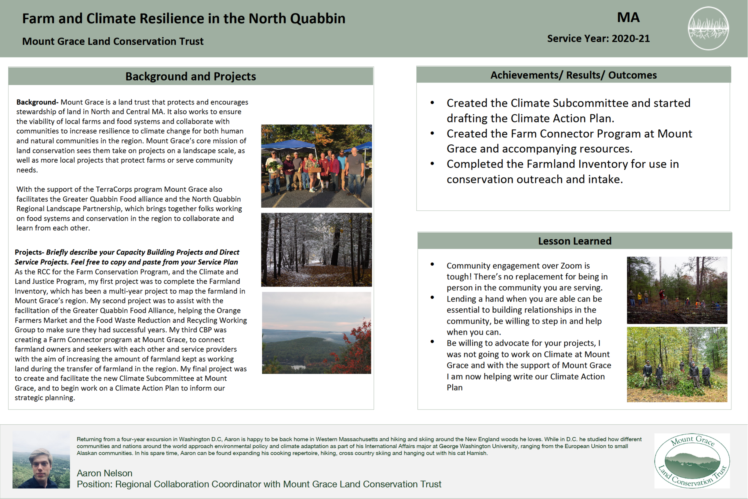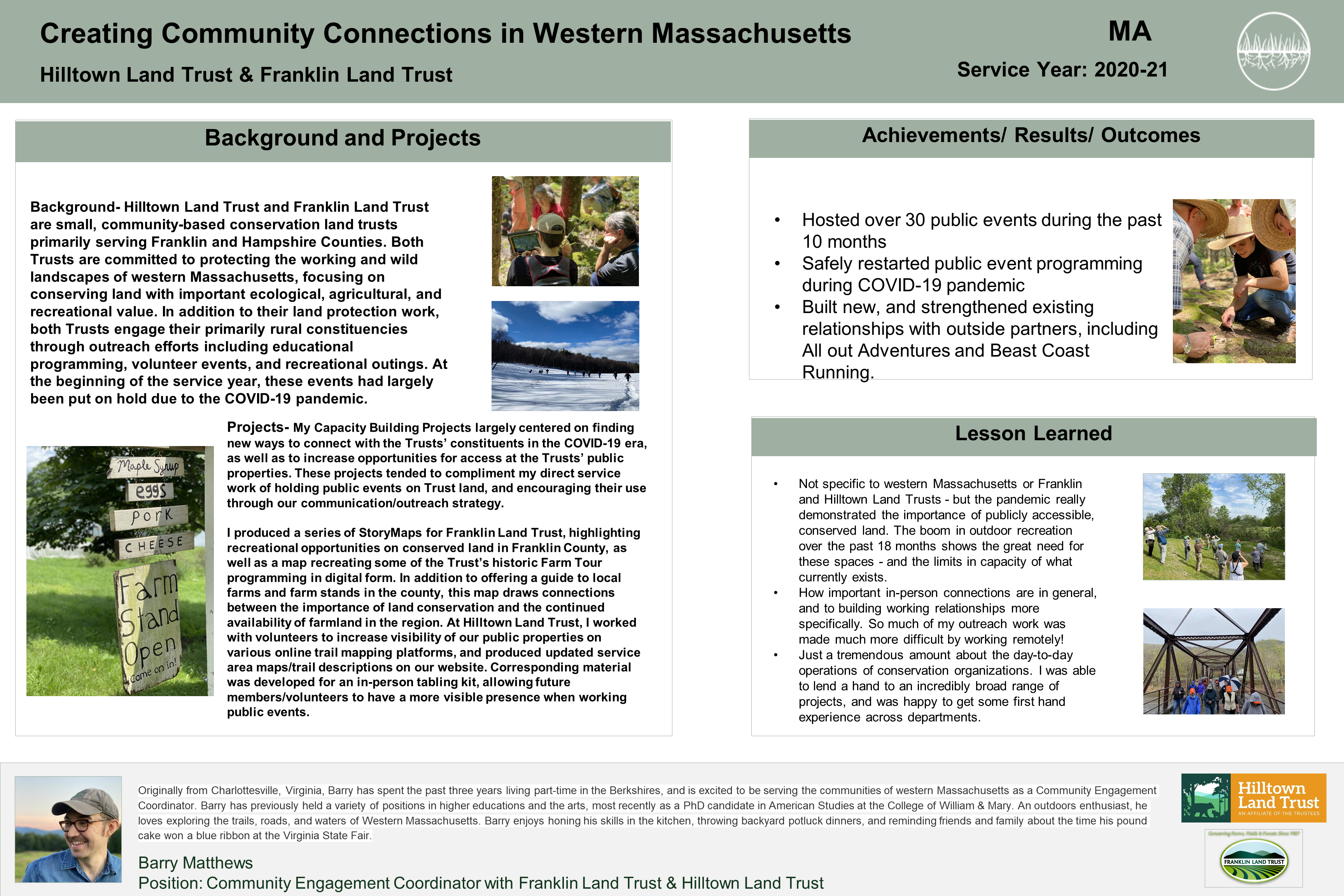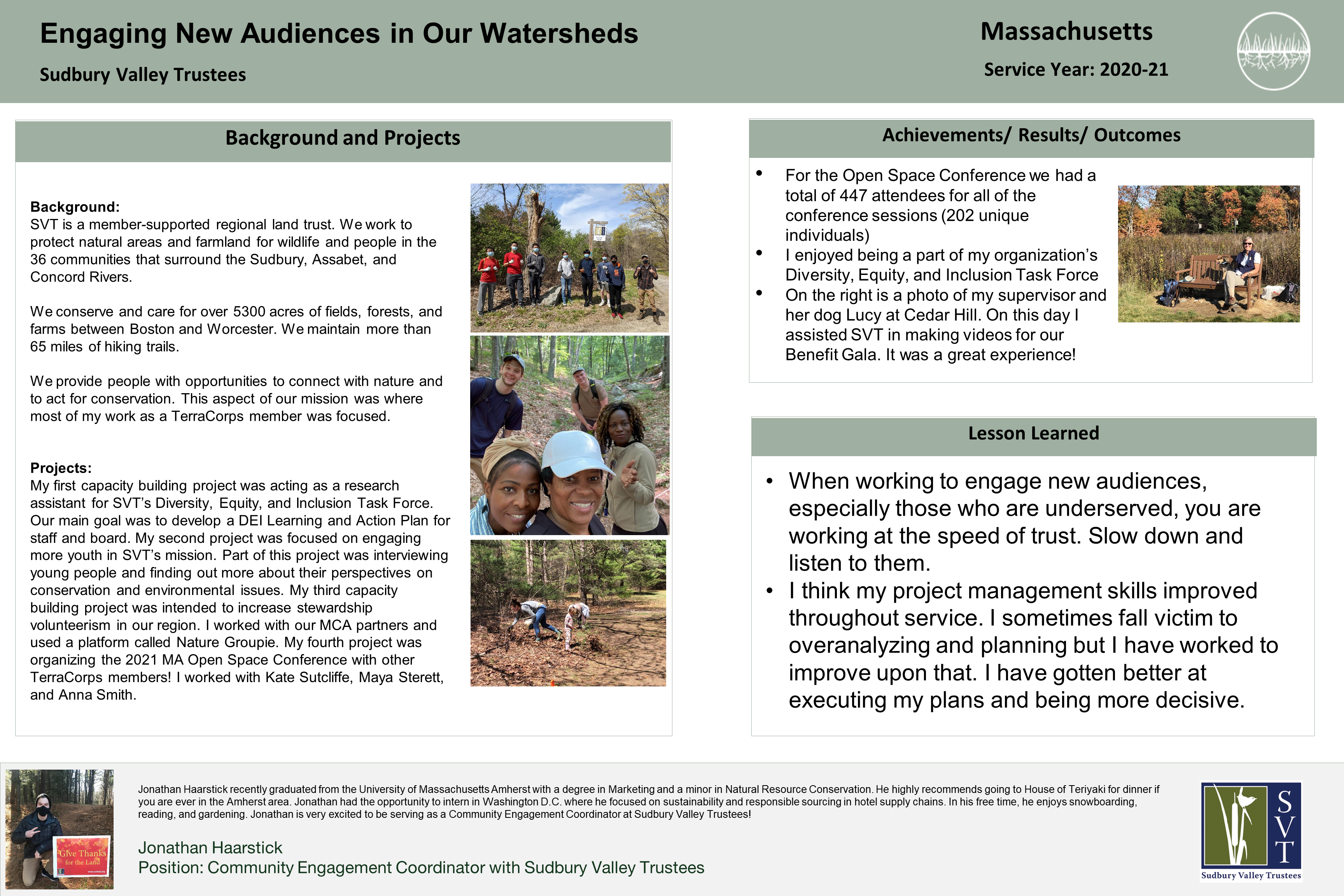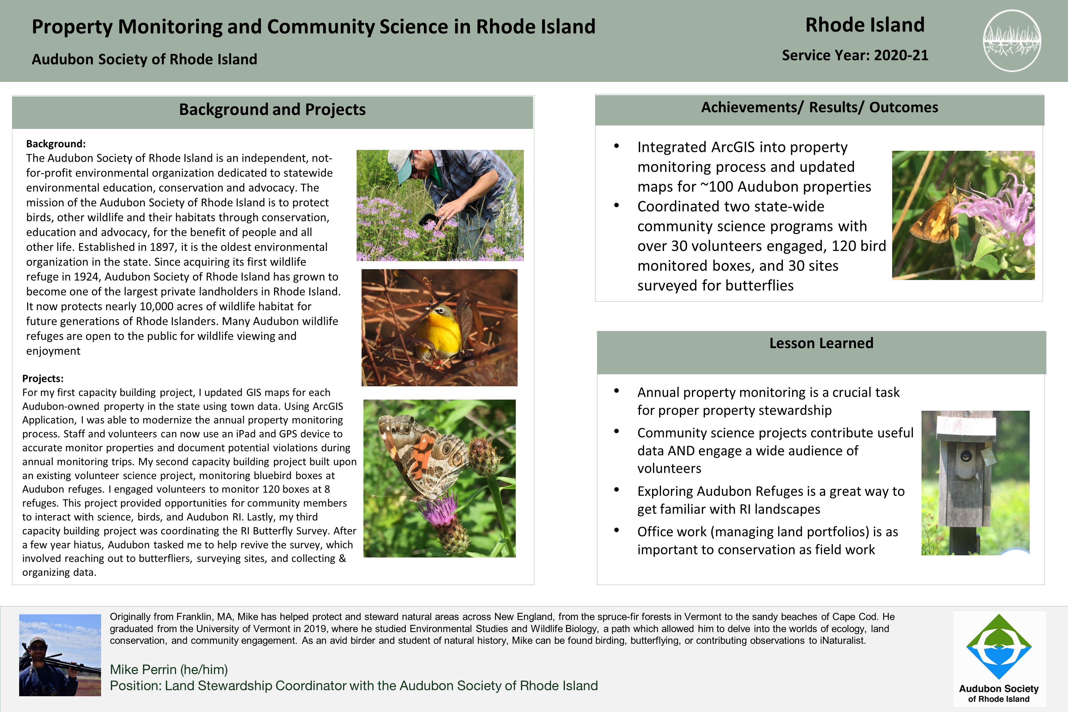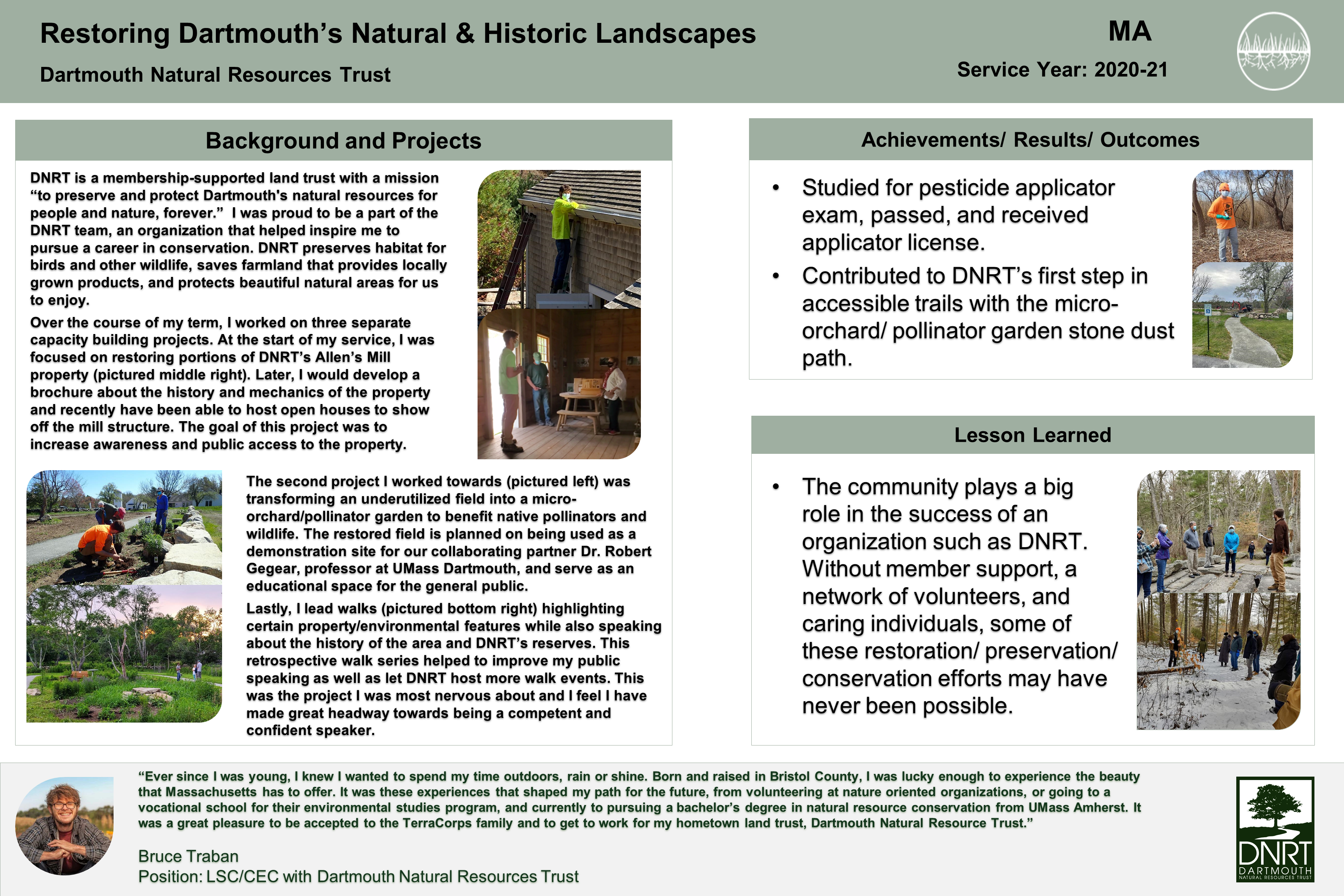 Member Project Posters MASSACHUSETTS 2020-2021 All Community Engagement Youth Education Land Stewardship Regional Collaboration Sustainable Agriculture Aaron Nelson Mount Grace Land Conservation Trust Amy Walker Charles River Watershed Association Anna Smith SEMPBA Anne Flaherty Natick Community Organic Farm Arylle Kathcart CitySprouts Audrey Boraski Hilltown Land Trust Barry Matthews Franklin Land Trust & Hilltown Land Trust Benee Hershon The Food Bank of Western Massachusetts Beth Cronin Round the Bend Farm Brooke Lummis Natick Community Organic Farm Bruce Traban Dartmouth Natural Resources Trust Carly Sharp Gardening the Community Derek Alford Growing Places Elizabeth Lohr Speak for the Trees, Boston Elsa Cline Mass Audubon Evan Foster Attleboro Land Trust Gabrielle Gundry Barnstable Land Trust Jamie Semel Mass Audubon Boston Nature Center Jenna Shea Mass Audubon and the Wareham Land Trust Joelle Boyle Emerald Necklace Conservancy Jonathan Haarstick Sudbury Valley Trustees Kate Schreiber Groundwork Somerville Kate Sutcliffe North Quabbin Regional Landscape Partnership and Mount Grace Land Conservation Trust Katie Adee Full Circle Earth Laura Brockington GreenRoots Laurel Branco Round the Bend Farm Macie Broussard Mass Audubon Conservation Science Maya Sterett Merrimack River Watershed Council Natalie Merline Speak for the Trees Nick Long Mass Audubon North Shore Sanctuaries Patrick Allison Jr. East Quabbin Land Trust Rachel Lee Sharon Mass Audubon Broadmoor Sarah Lucia Community Involved in Sustaining Agriculture Sylvie Raymond GreenRoots Tess O’Day Emerald Necklace Conservancy Victoria Prend Growing Places Zoe Chambliss Natick Community Organic Farm Load More RHODE ISLAND 2020-2021 All Community Engagement Youth Education Land Stewardship Regional Collaboration Sustainable Agriculture Adam Kaszas Aquidneck Community Table Anjali Gordon Aquidneck Community Table Clare Brown Woonasquatucket River Watershed Council Eric Wuesthoff Rhode Island Land Trust Council Joseph Barnes Westerly Land Trust Mike Perrin Audubon Society of Rhode Island Naya Black Woonasquatucket River Watershed Council Oliwia (Olive) Krupinska Southside Community Land Trust Sarah Chin Woonasquatucket River Watershed Council Load More