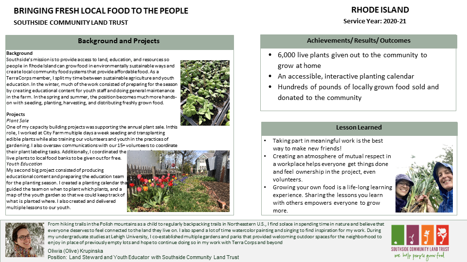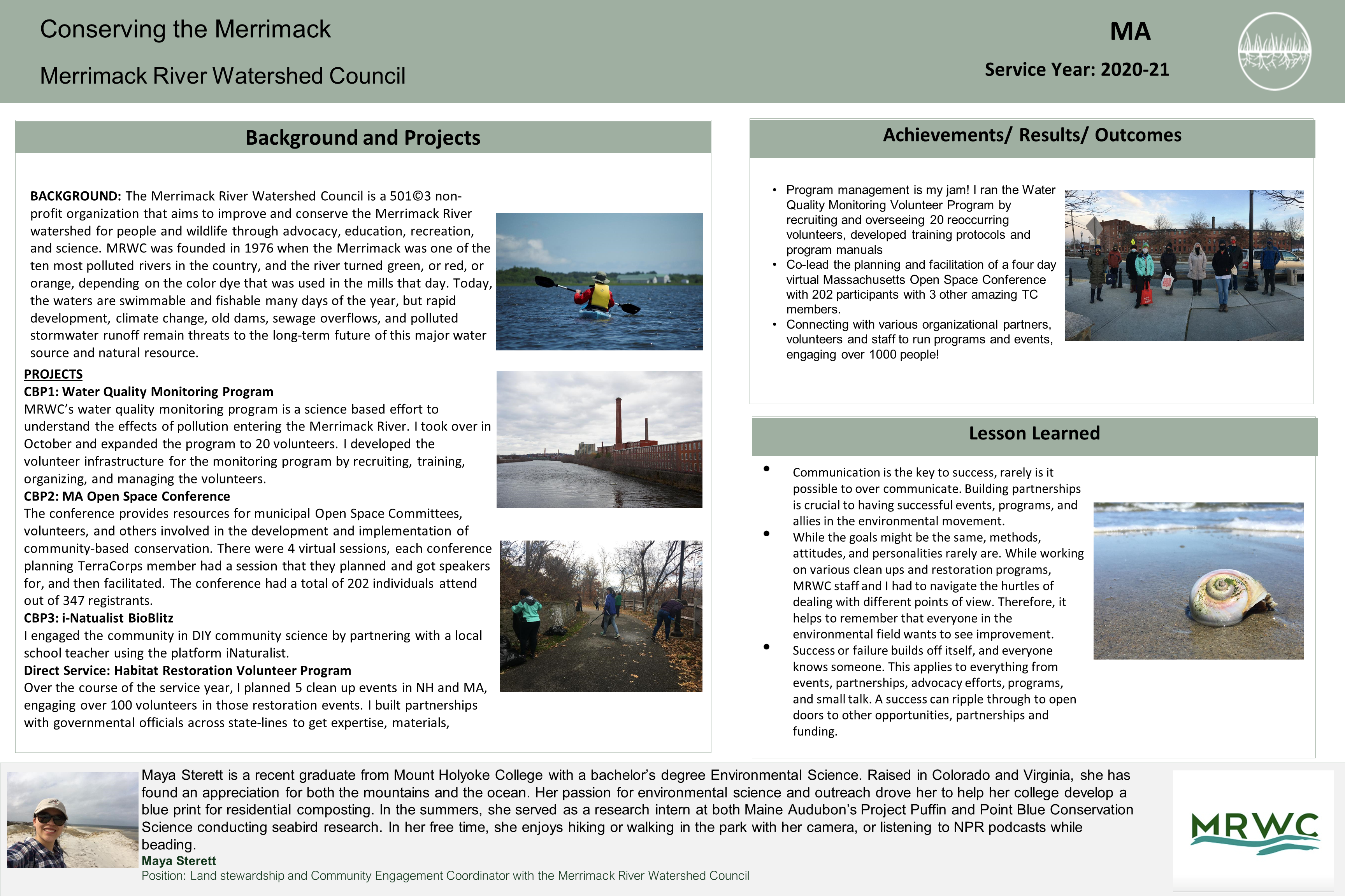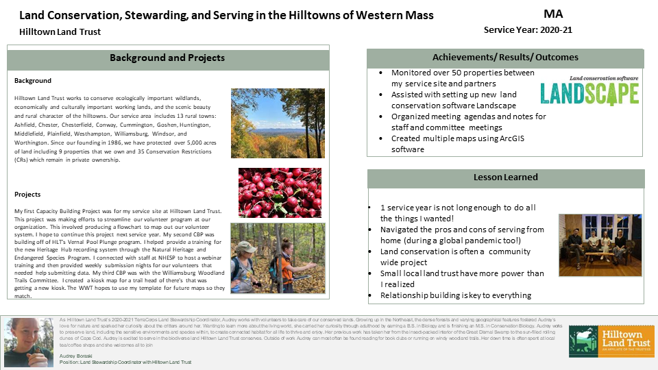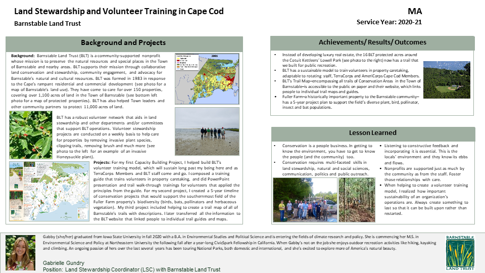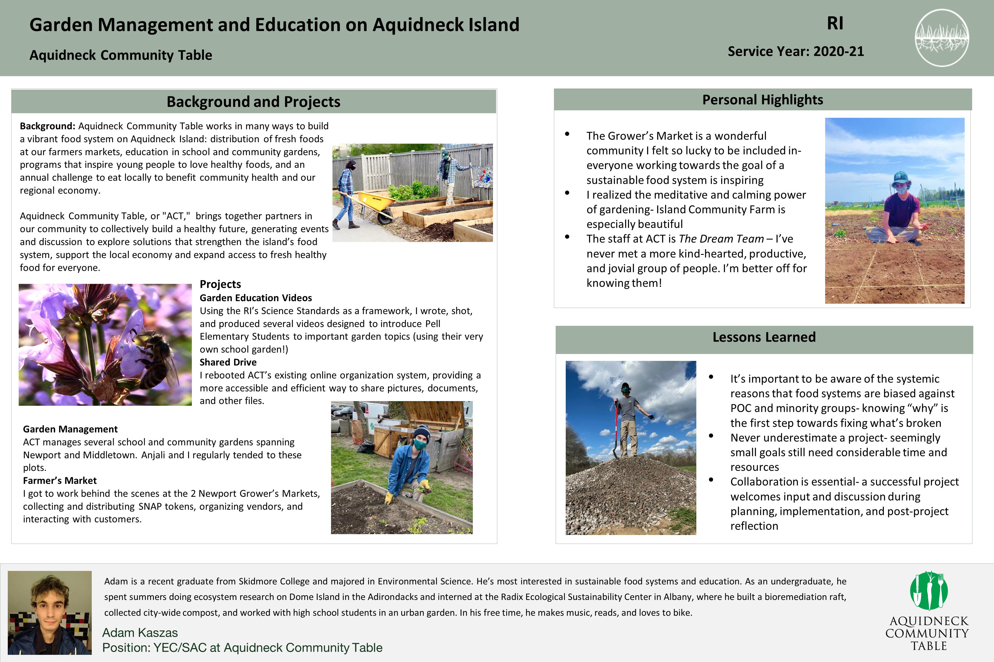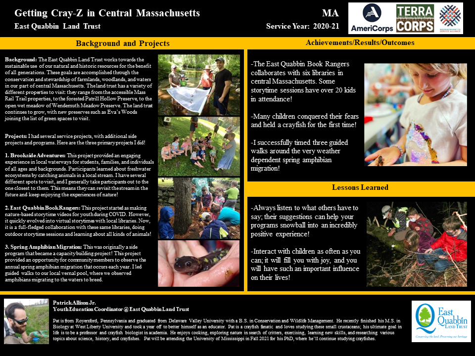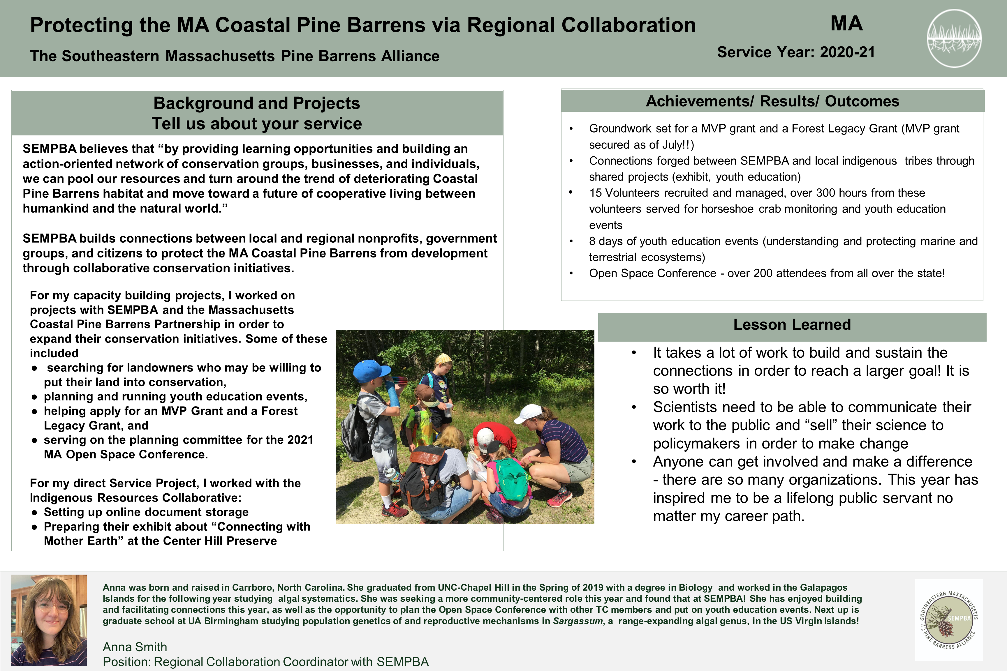 Member Project Posters MASSACHUSETTS 2020-2021 All Community Engagement Youth Education Land Stewardship Regional Collaboration Sustainable Agriculture Aaron Nelson Mount Grace Land Conservation Trust Amy Walker Charles River Watershed Association Anna Smith SEMPBA Anne Flaherty Natick Community Organic Farm Arylle Kathcart CitySprouts Audrey Boraski Hilltown Land Trust Barry Matthews Franklin Land Trust & Hilltown Land Trust Benee Hershon The Food Bank of Western Massachusetts Beth Cronin Round the Bend Farm Brooke Lummis Natick Community Organic Farm Bruce Traban Dartmouth Natural Resources Trust Carly Sharp Gardening the Community Derek Alford Growing Places Elizabeth Lohr Speak for the Trees, Boston Elsa Cline Mass Audubon Evan Foster Attleboro Land Trust Gabrielle Gundry Barnstable Land Trust Jamie Semel Mass Audubon Boston Nature Center Jenna Shea Mass Audubon and the Wareham Land Trust Joelle Boyle Emerald Necklace Conservancy Jonathan Haarstick Sudbury Valley Trustees Kate Schreiber Groundwork Somerville Kate Sutcliffe North Quabbin Regional Landscape Partnership and Mount Grace Land Conservation Trust Katie Adee Full Circle Earth Laura Brockington GreenRoots Laurel Branco Round the Bend Farm Macie Broussard Mass Audubon Conservation Science Maya Sterett Merrimack River Watershed Council Natalie Merline Speak for the Trees Nick Long Mass Audubon North Shore Sanctuaries Patrick Allison Jr. East Quabbin Land Trust Rachel Lee Sharon Mass Audubon Broadmoor Sarah Lucia Community Involved in Sustaining Agriculture Sylvie Raymond GreenRoots Tess O’Day Emerald Necklace Conservancy Victoria Prend Growing Places Zoe Chambliss Natick Community Organic Farm Load More RHODE ISLAND 2020-2021 All Community Engagement Youth Education Land Stewardship Regional Collaboration Sustainable Agriculture Adam Kaszas Aquidneck Community Table Anjali Gordon Aquidneck Community Table Clare Brown Woonasquatucket River Watershed Council Eric Wuesthoff Rhode Island Land Trust Council Joseph Barnes Westerly Land Trust Mike Perrin Audubon Society of Rhode Island Naya Black Woonasquatucket River Watershed Council Oliwia (Olive) Krupinska Southside Community Land Trust Sarah Chin Woonasquatucket River Watershed Council Load More