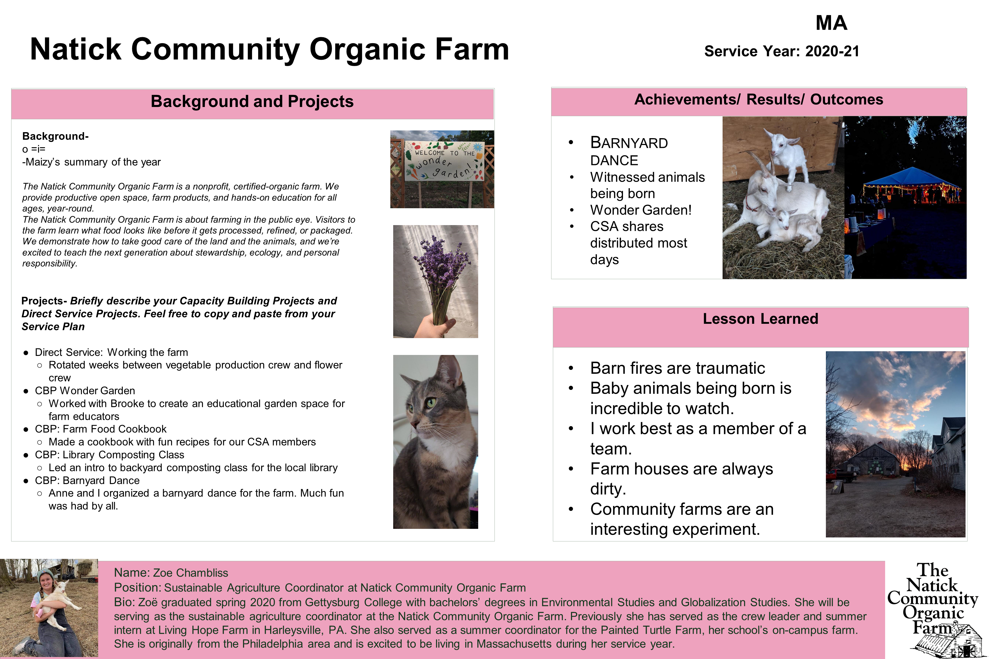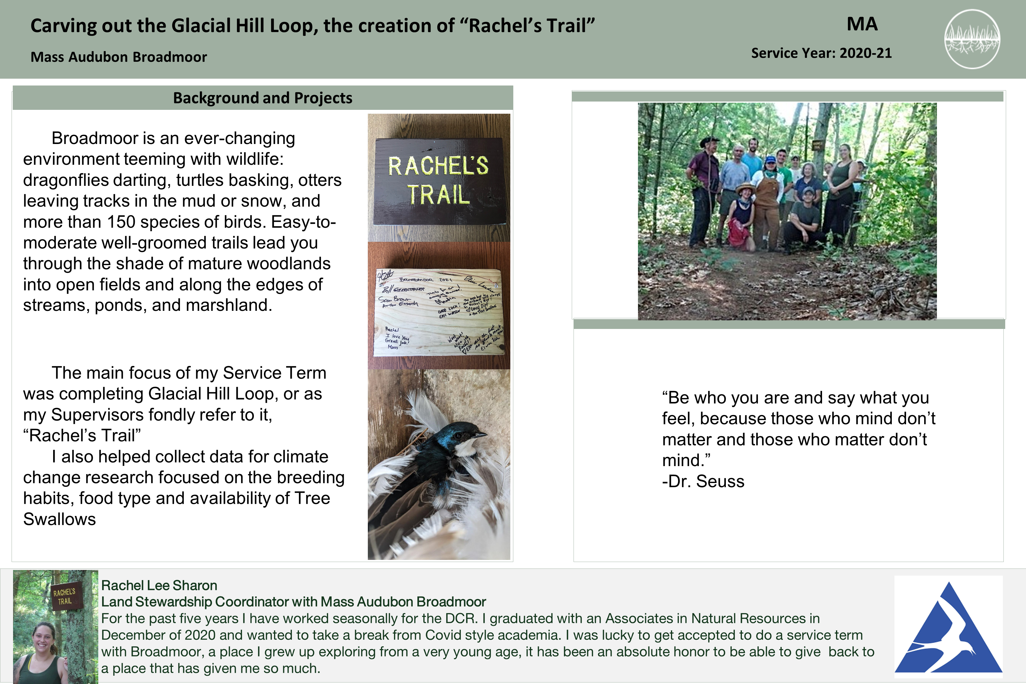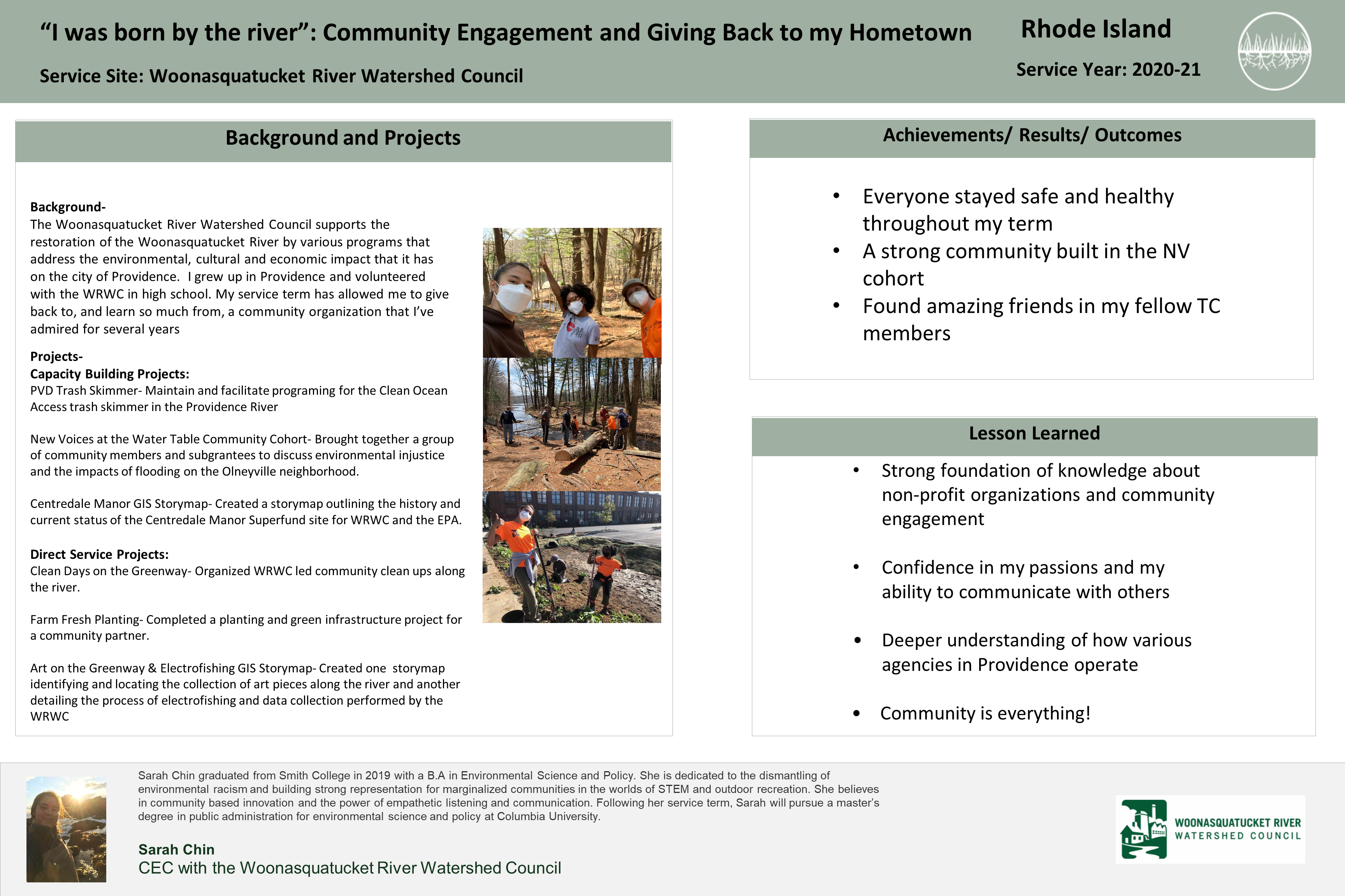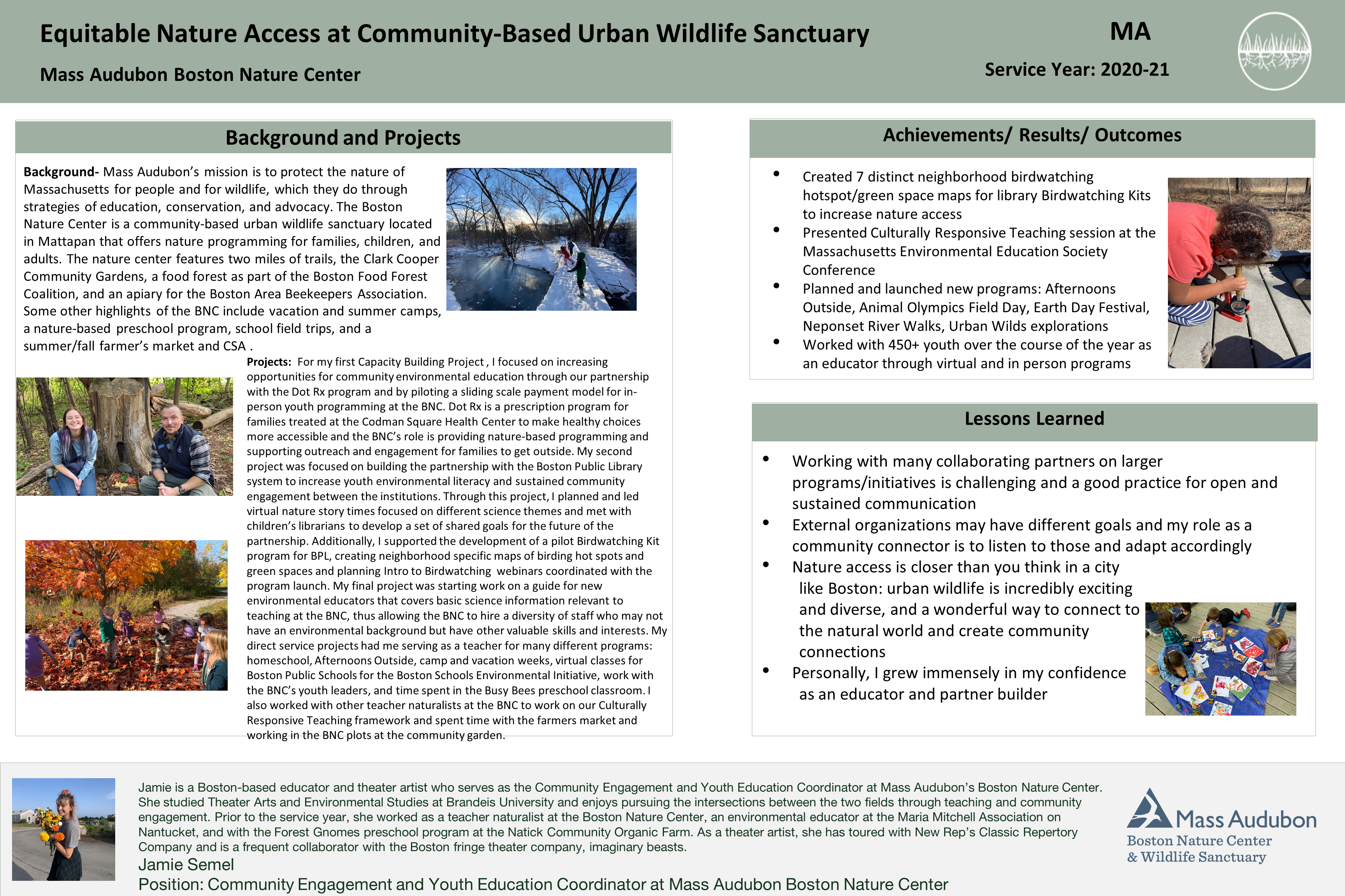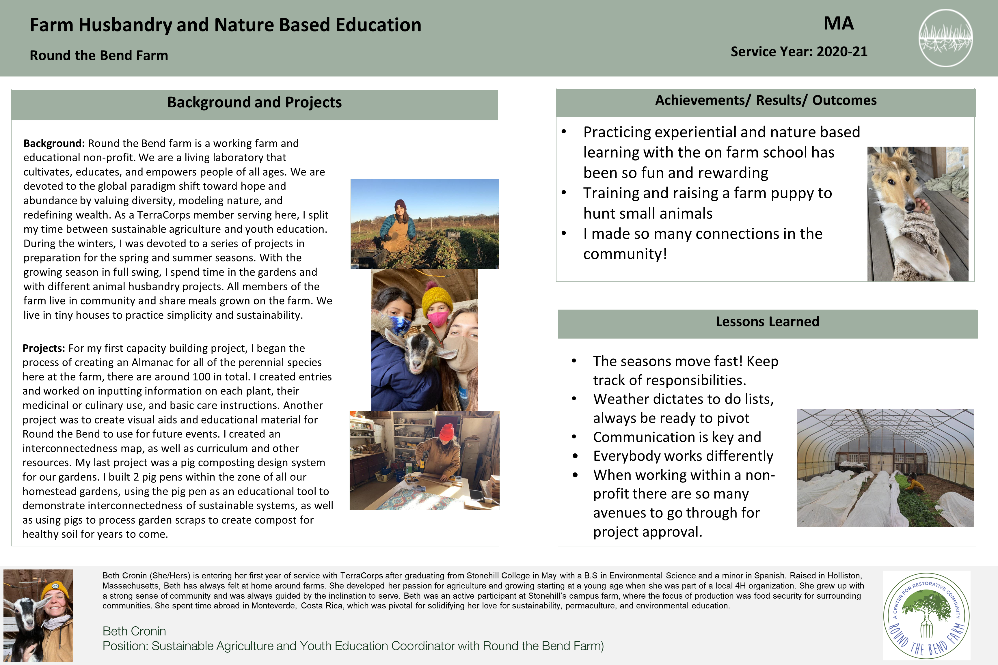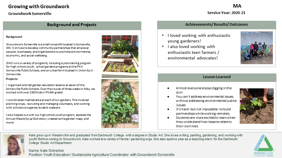 Member Project Posters MASSACHUSETTS 2020-2021 All Community Engagement Youth Education Land Stewardship Regional Collaboration Sustainable Agriculture Aaron Nelson Mount Grace Land Conservation Trust Amy Walker Charles River Watershed Association Anna Smith SEMPBA Anne Flaherty Natick Community Organic Farm Arylle Kathcart CitySprouts Audrey Boraski Hilltown Land Trust Barry Matthews Franklin Land Trust & Hilltown Land Trust Benee Hershon The Food Bank of Western Massachusetts Beth Cronin Round the Bend Farm Brooke Lummis Natick Community Organic Farm Bruce Traban Dartmouth Natural Resources Trust Carly Sharp Gardening the Community Derek Alford Growing Places Elizabeth Lohr Speak for the Trees, Boston Elsa Cline Mass Audubon Evan Foster Attleboro Land Trust Gabrielle Gundry Barnstable Land Trust Jamie Semel Mass Audubon Boston Nature Center Jenna Shea Mass Audubon and the Wareham Land Trust Joelle Boyle Emerald Necklace Conservancy Jonathan Haarstick Sudbury Valley Trustees Kate Schreiber Groundwork Somerville Kate Sutcliffe North Quabbin Regional Landscape Partnership and Mount Grace Land Conservation Trust Katie Adee Full Circle Earth Laura Brockington GreenRoots Laurel Branco Round the Bend Farm Macie Broussard Mass Audubon Conservation Science Maya Sterett Merrimack River Watershed Council Natalie Merline Speak for the Trees Nick Long Mass Audubon North Shore Sanctuaries Patrick Allison Jr. East Quabbin Land Trust Rachel Lee Sharon Mass Audubon Broadmoor Sarah Lucia Community Involved in Sustaining Agriculture Sylvie Raymond GreenRoots Tess O’Day Emerald Necklace Conservancy Victoria Prend Growing Places Zoe Chambliss Natick Community Organic Farm Load More RHODE ISLAND 2020-2021 All Community Engagement Youth Education Land Stewardship Regional Collaboration Sustainable Agriculture Adam Kaszas Aquidneck Community Table Anjali Gordon Aquidneck Community Table Clare Brown Woonasquatucket River Watershed Council Eric Wuesthoff Rhode Island Land Trust Council Joseph Barnes Westerly Land Trust Mike Perrin Audubon Society of Rhode Island Naya Black Woonasquatucket River Watershed Council Oliwia (Olive) Krupinska Southside Community Land Trust Sarah Chin Woonasquatucket River Watershed Council Load More