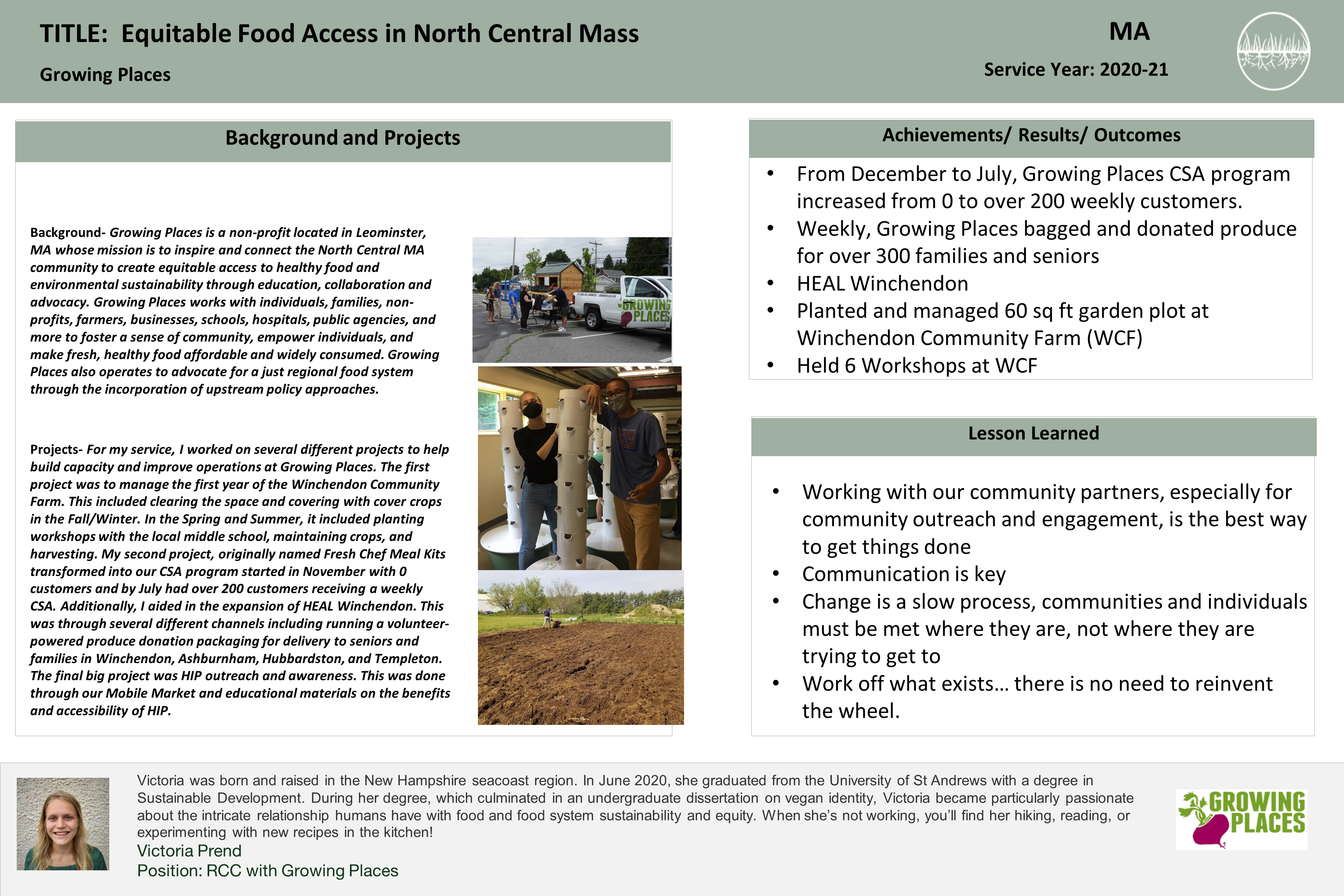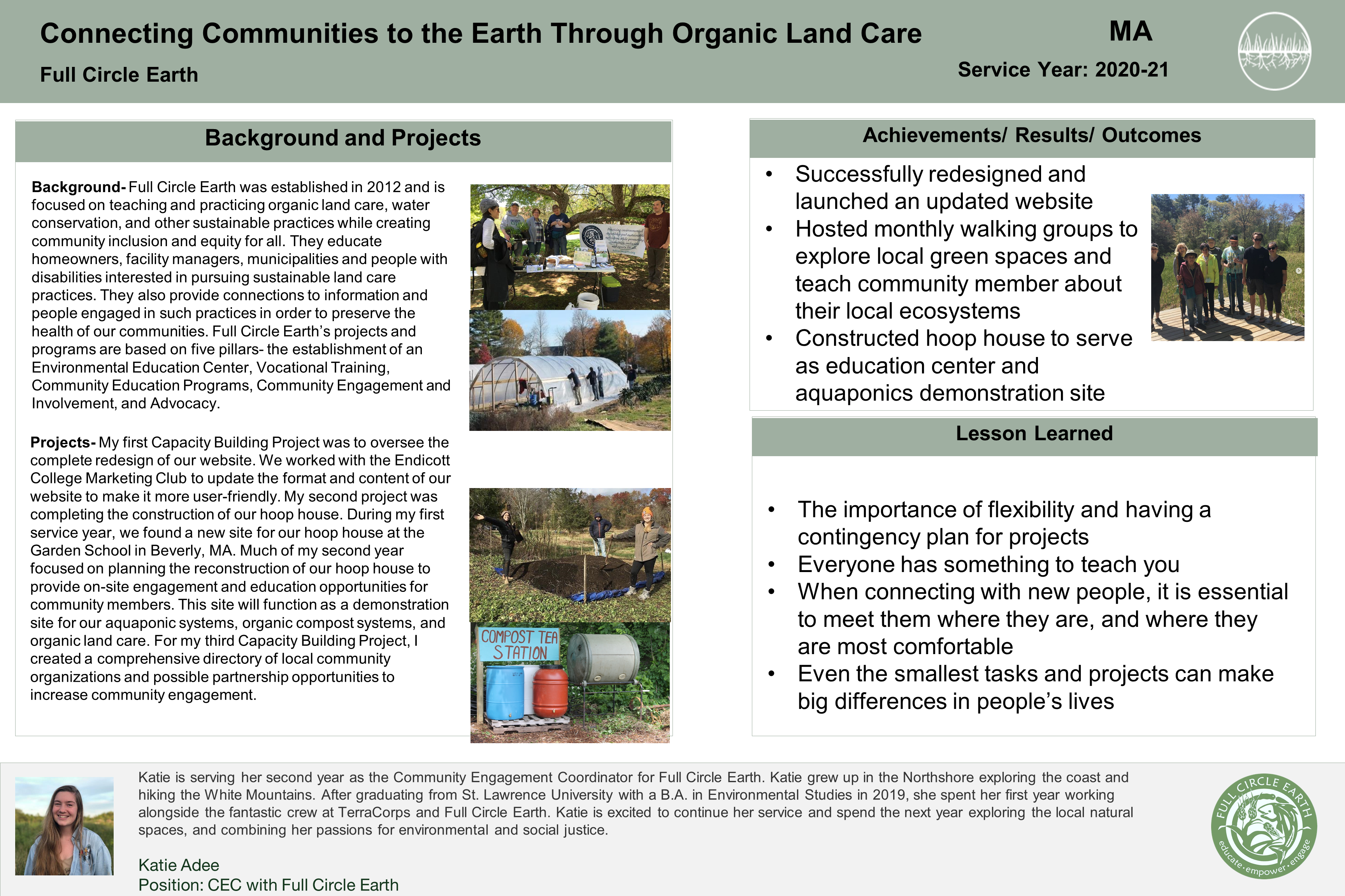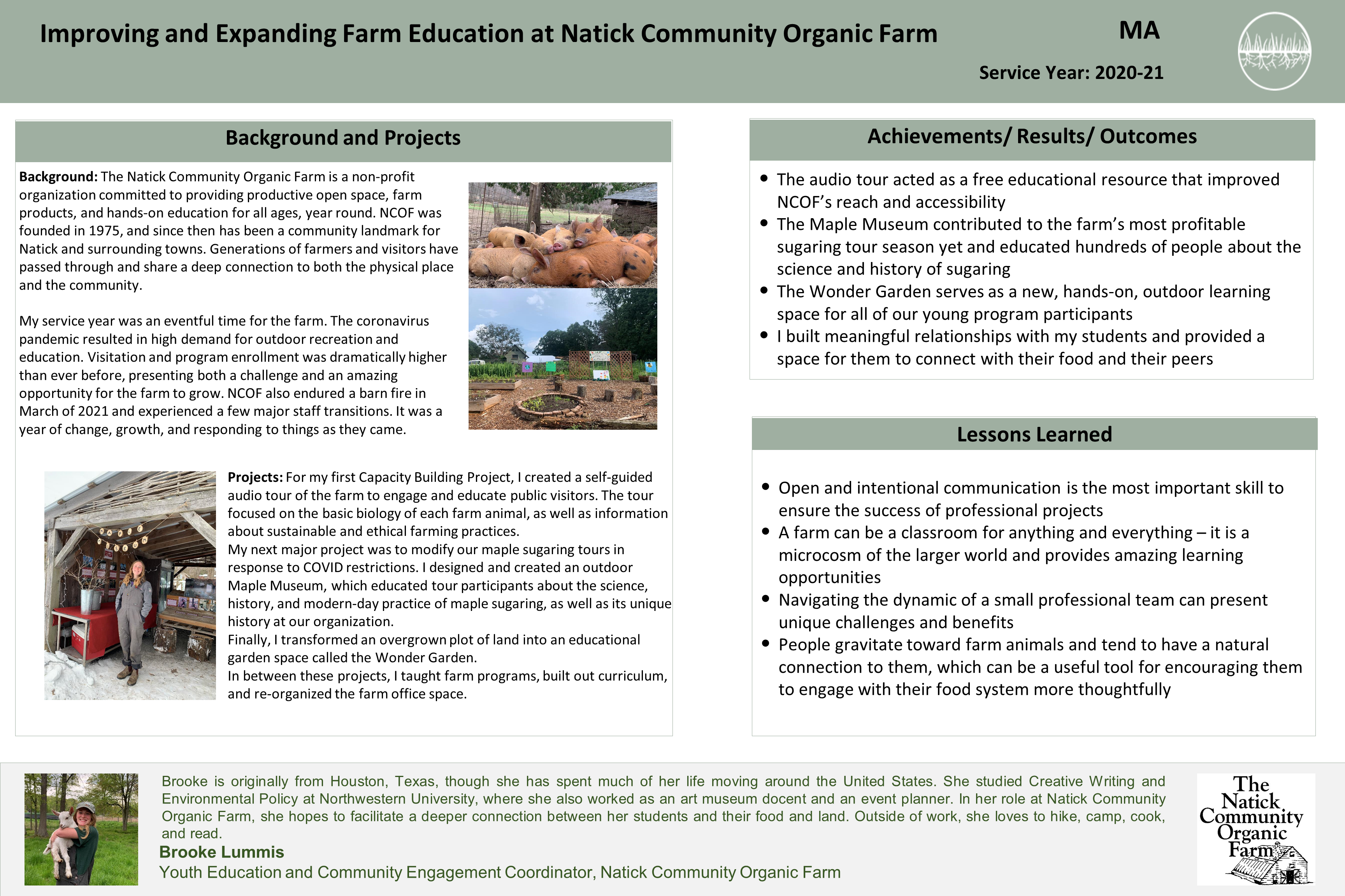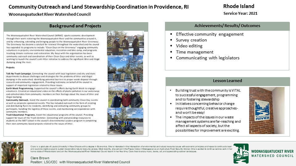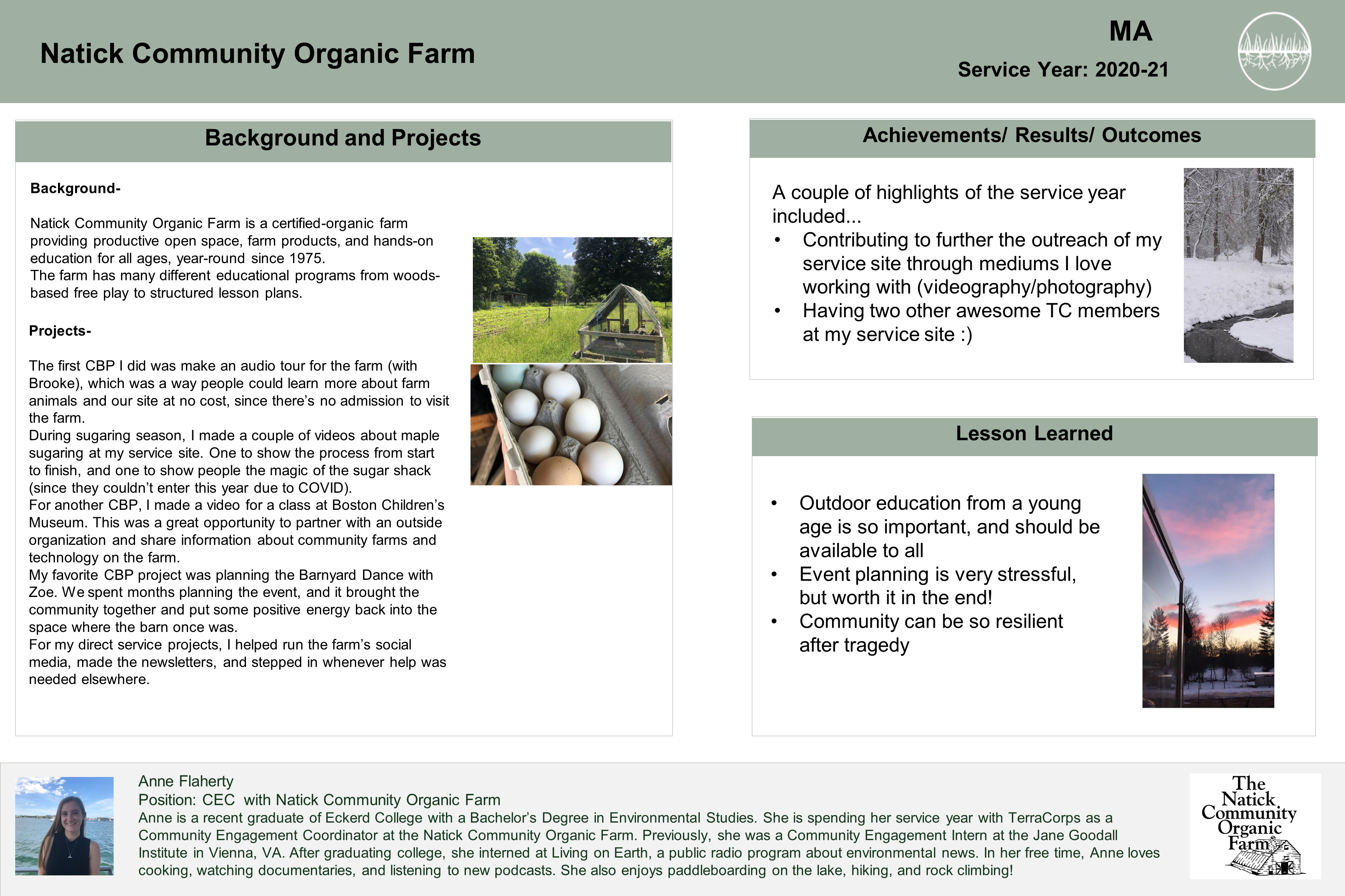 Member Project Posters MASSACHUSETTS 2020-2021 All Community Engagement Youth Education Land Stewardship Regional Collaboration Sustainable Agriculture Aaron Nelson Mount Grace Land Conservation Trust Amy Walker Charles River Watershed Association Anna Smith SEMPBA Anne Flaherty Natick Community Organic Farm Arylle Kathcart CitySprouts Audrey Boraski Hilltown Land Trust Barry Matthews Franklin Land Trust & Hilltown Land Trust Benee Hershon The Food Bank of Western Massachusetts Beth Cronin Round the Bend Farm Brooke Lummis Natick Community Organic Farm Bruce Traban Dartmouth Natural Resources Trust Carly Sharp Gardening the Community Derek Alford Growing Places Elizabeth Lohr Speak for the Trees, Boston Elsa Cline Mass Audubon Evan Foster Attleboro Land Trust Gabrielle Gundry Barnstable Land Trust Jamie Semel Mass Audubon Boston Nature Center Jenna Shea Mass Audubon and the Wareham Land Trust Joelle Boyle Emerald Necklace Conservancy Jonathan Haarstick Sudbury Valley Trustees Kate Schreiber Groundwork Somerville Kate Sutcliffe North Quabbin Regional Landscape Partnership and Mount Grace Land Conservation Trust Katie Adee Full Circle Earth Laura Brockington GreenRoots Laurel Branco Round the Bend Farm Macie Broussard Mass Audubon Conservation Science Maya Sterett Merrimack River Watershed Council Natalie Merline Speak for the Trees Nick Long Mass Audubon North Shore Sanctuaries Patrick Allison Jr. East Quabbin Land Trust Rachel Lee Sharon Mass Audubon Broadmoor Sarah Lucia Community Involved in Sustaining Agriculture Sylvie Raymond GreenRoots Tess O’Day Emerald Necklace Conservancy Victoria Prend Growing Places Zoe Chambliss Natick Community Organic Farm Load More RHODE ISLAND 2020-2021 All Community Engagement Youth Education Land Stewardship Regional Collaboration Sustainable Agriculture Adam Kaszas Aquidneck Community Table Anjali Gordon Aquidneck Community Table Clare Brown Woonasquatucket River Watershed Council Eric Wuesthoff Rhode Island Land Trust Council Joseph Barnes Westerly Land Trust Mike Perrin Audubon Society of Rhode Island Naya Black Woonasquatucket River Watershed Council Oliwia (Olive) Krupinska Southside Community Land Trust Sarah Chin Woonasquatucket River Watershed Council Load More
